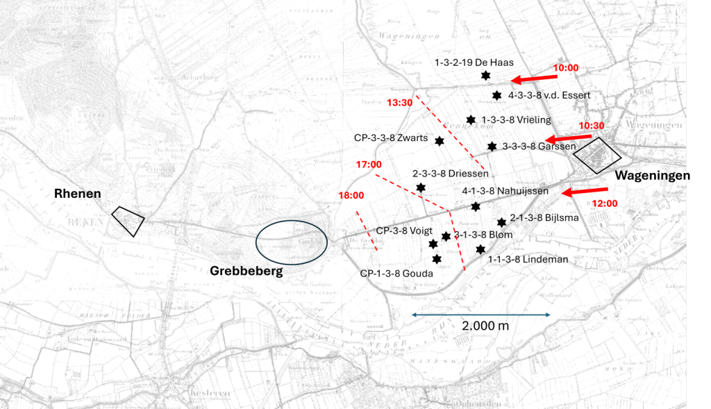 De compagnie van Gouda was opgesteld in een gebied van zo’n 1.000 bij 1.000 meter. Voor hedendaagse begrippen is dat een enorm gebied, te groot om met een compagnie te verdedigen. Gouda zijn compagnie bestond uit 4 secties, verdeeld over 19 groepssteunpunten, elk bezet met een lichte mitrailleur, en een compagniescommandopost. De 1e sectie van Bijlsma vooraan, vlak tegen Wageningen. Daar linksachter de 4e sectie van Nahuijssen, rechtsachter de 1e sectie van Lindeman. Blom was met zijn 3e sectie de Hekkesluiter. En compagniescommandant Gouda zat met zijn commandopost weer achter Blom.